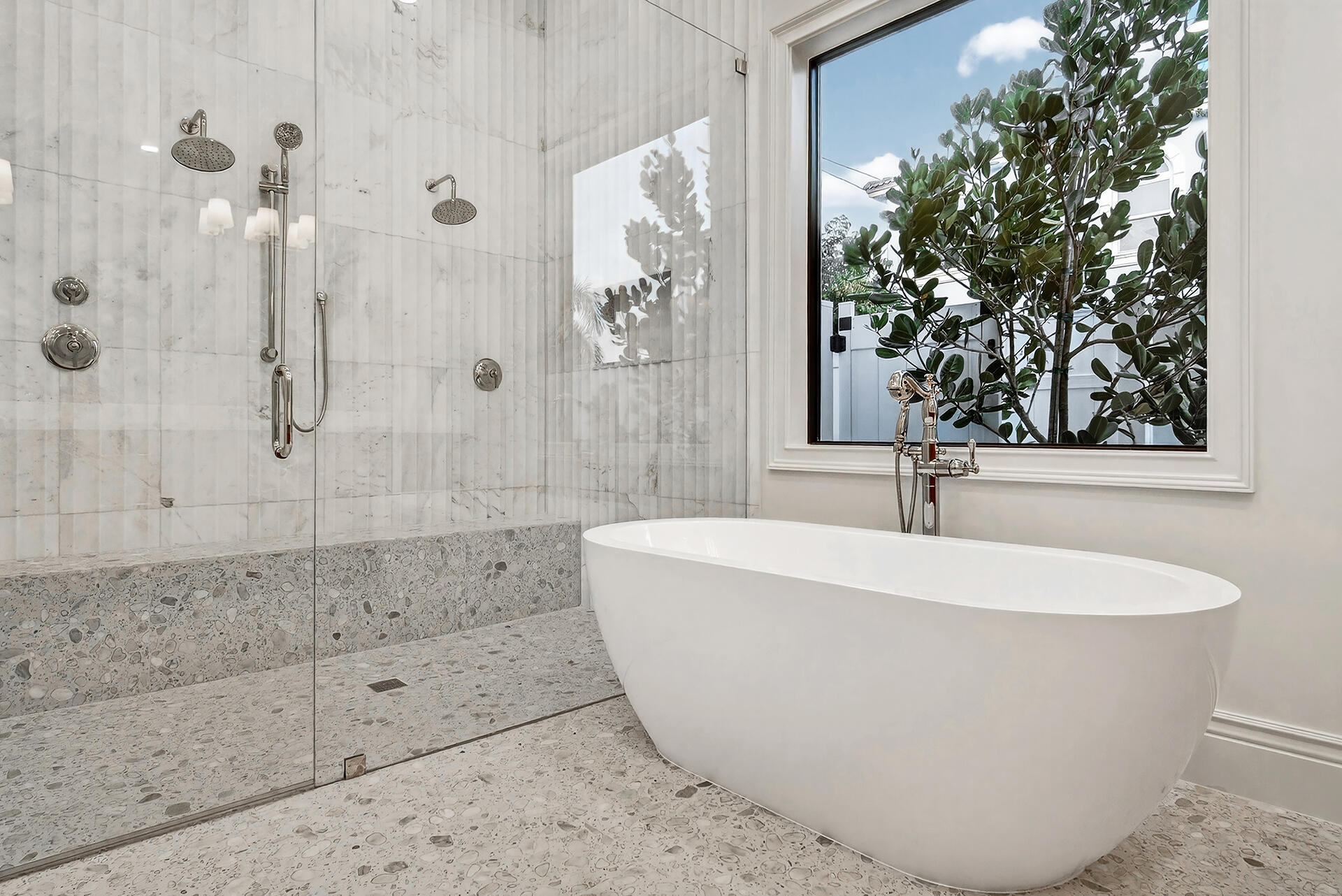Completed in 2025, this new-construction residence is ideally positioned on a quiet street within the sought-after SoSo enclave, offering coastal living moments from the Intracoastal Waterway. Spanning 4,358 SF of living space (5,133 TSF), the home features five bedrooms, an office, five full baths, and one half-bath. The layout includes a first-floor primary suite and a second upstairs primary suite, providing rare flexibility for modern living. Light-filled interiors showcase clean architectural lines, volume ceilings, wood flooring, and an open-concept layout that flows seamlessly to covered outdoor living, pool, and spa. Select second-floor rooms offer glimpses of the Intracoastal. Located near the Flagler Drive bike path, Summa Beach, tennis and golf, marinas, downtown West Palm Beach, CityPlace, and PBI Airport, the home enjoys a quiet residential setting with convenient access to Palm Beach Island and the surrounding waterfront and beaches.