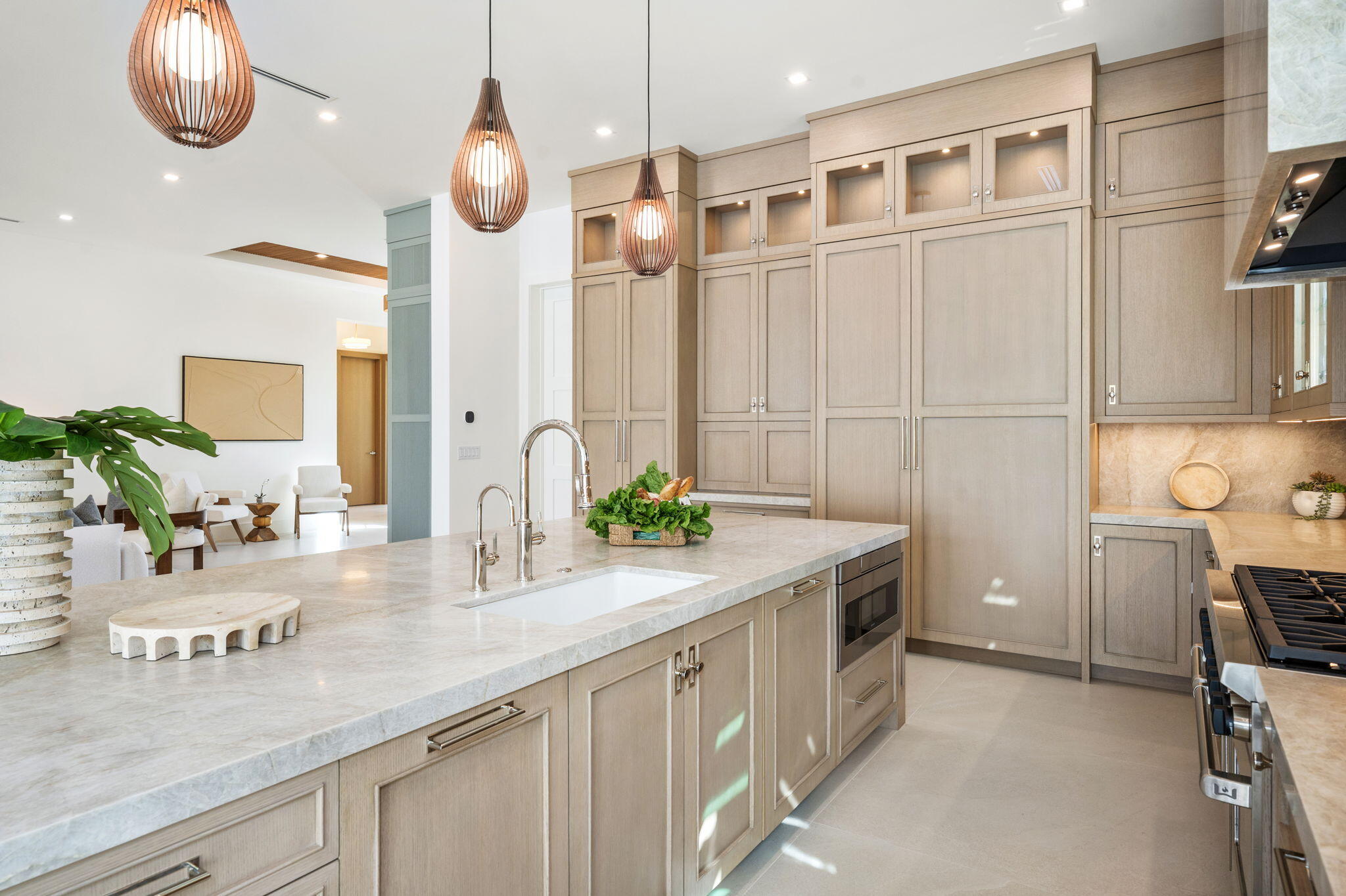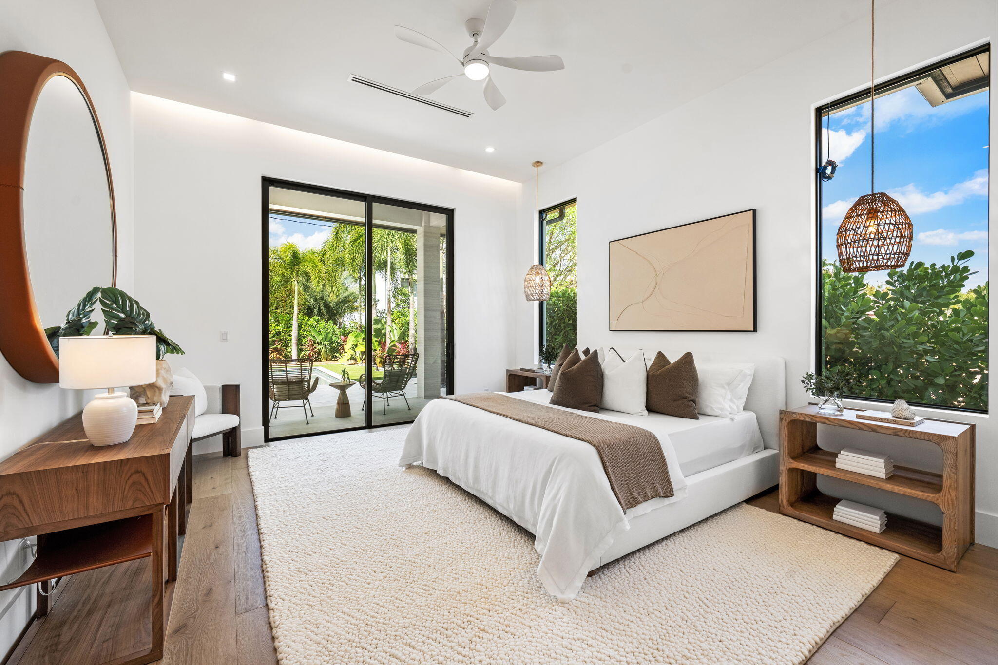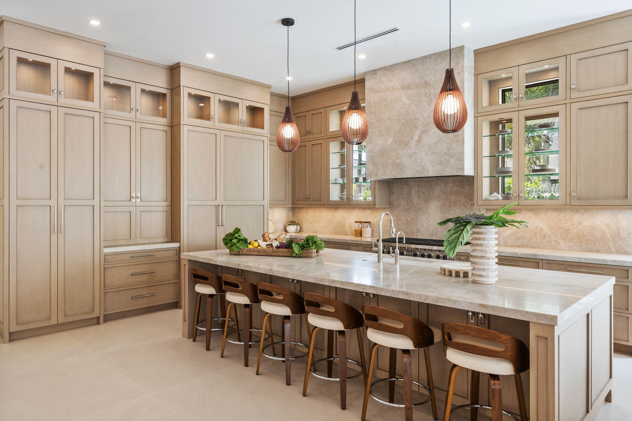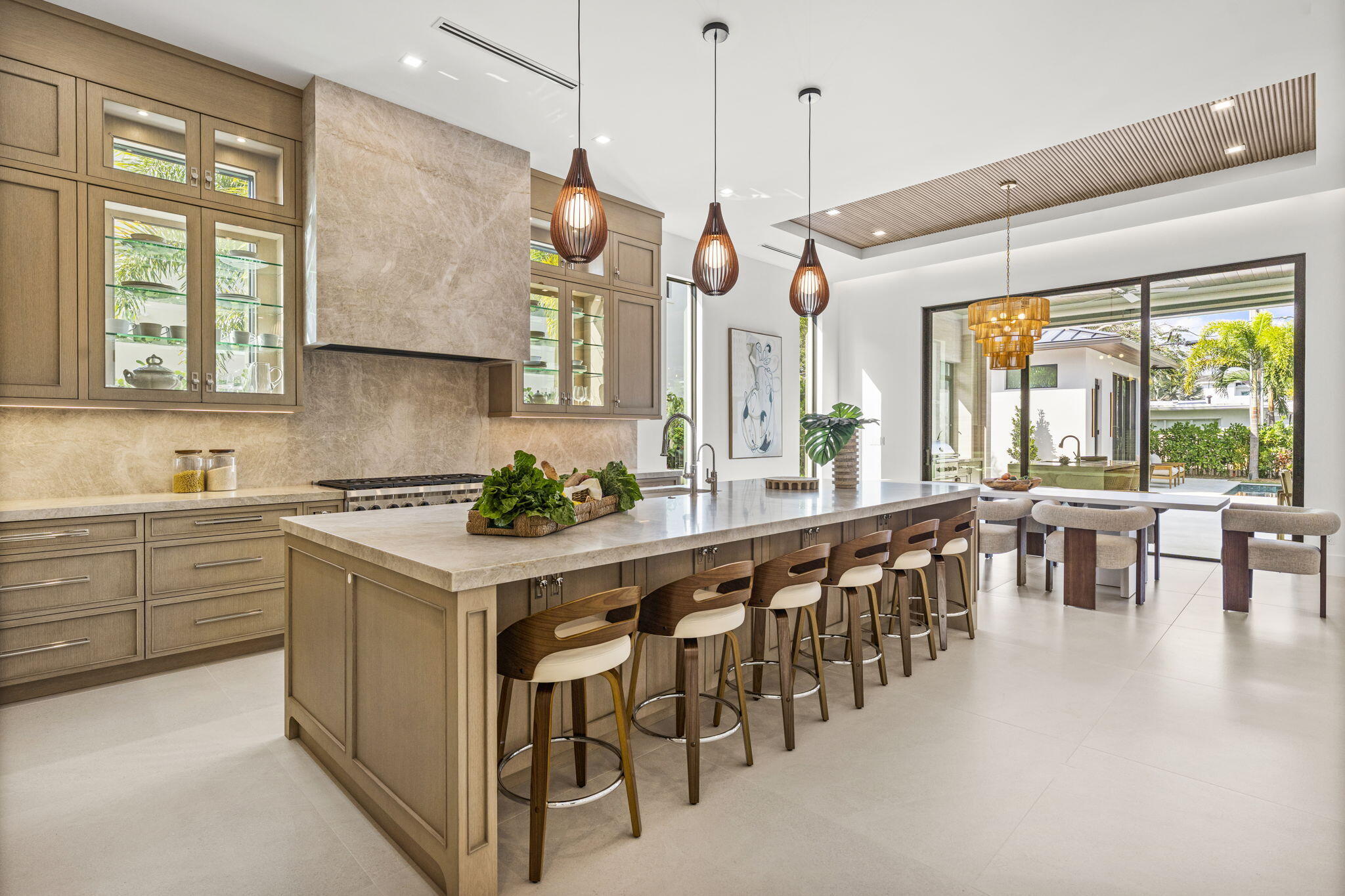 Welcome to 247 Seville Road, a 2025 modern-coastal residence with subtle Balinese influence, custom built by Spyglass Development. Set on an oversized 11,285 SF lot in West Palm Beach's highly desirable SoSo neighborhood, this newly completed estate blends architectural detail, material quality, and livable design into a refined coastal retreat. Offering 6,378 total square feet with 5,112 SF of living space, the main residence includes 4 bedrooms plus an office, 4 full baths and 1 half bath, a double garage, and elevator across 4,785 SF. A detached 327 SF cabana/flex suite with full bath, outdoor shower, and Sub-Zero under-counter drawers functions as a fifth bedroom, guest suite, private office, or fitness studio. A porcelain-travertine facade and 10-foot entry door open to interiors defined by 11'6" ceiling heights with 12-foot coffered accents, 9-foot interior doors on the main level, 10-foot exterior sliders, 48x48 Italian porcelain flooring, and a floating white-oak and glass staircase. Rift-cut white oak cabinetry, fluted wall detailing, and integrated architectural millwork carry throughout the home. The chef's kitchen features Nika Quartzite countertops, a 12' x 5' island, Sub-Zero refrigeration towers, a 48" Wolf 8-burner range, walk-in pantry, and a custom rift-cut oak bar with Sub-Zero wine tower. The first-floor primary suite includes oak flooring, dual custom closets, and a spa-style bath with dual 16-foot showers, soaking tub, and dual water closets. A dedicated office with oak flooring and American black walnut cabinetry is also located on the main level. The second floor offers 10-foot ceilings, a loft with built-ins and Sub-Zero beverage center, secondary laundry, and three en-suite bedrooms including a VIP suite. Bathrooms are finished with imported Spanish porcelain tile and custom cabinetry. Upper-level interior doors are 8 feet. Twelve-foot-wide bypass stackable doors open to a covered loggia with travertine fireplace wall, summer kitchen with grill, sink, and refrigerator, cypress cabinetry, remote-controlled screens, designer lighting, and aluminum tongue-and-groove ceiling in a wood-look finish. The 37 x 16 saltwater pool with sun shelf and 9 x 9 spa are set within professionally designed tropical landscaping. Additional features include a whole-house generator, engineered site drainage system, concrete subfloors for structural and sound stability, EV pre-wire, and an air-conditioned double garage. Located on a quiet, tree-lined street east of Olive Avenue, the residence is moments from Intracoastal Waterway, Summa Beach, Flagler Drive bike path, marinas, golf, dining, Palm Beach Island, downtown West Palm Beach, and Palm Beach International Airport.