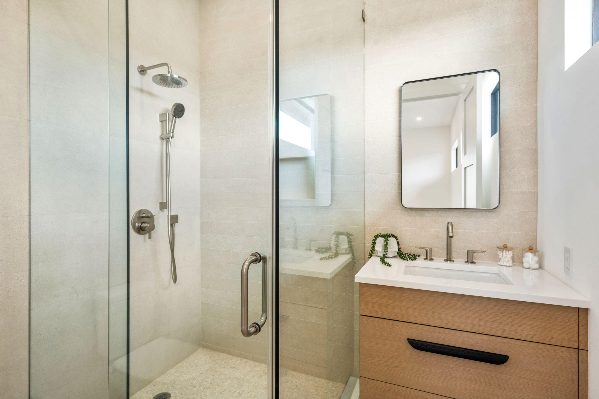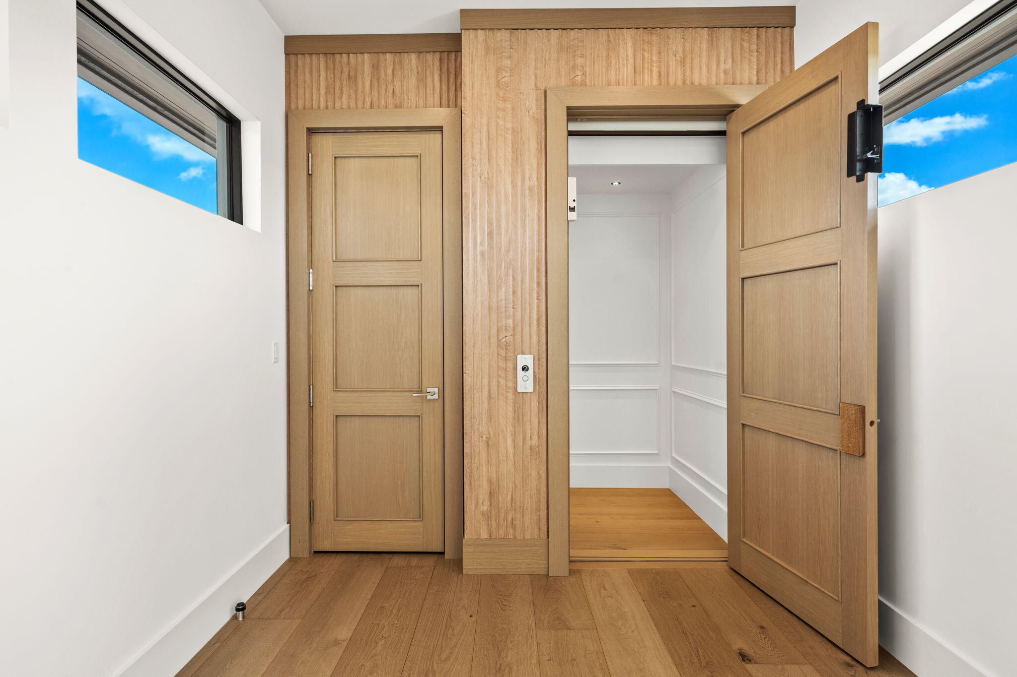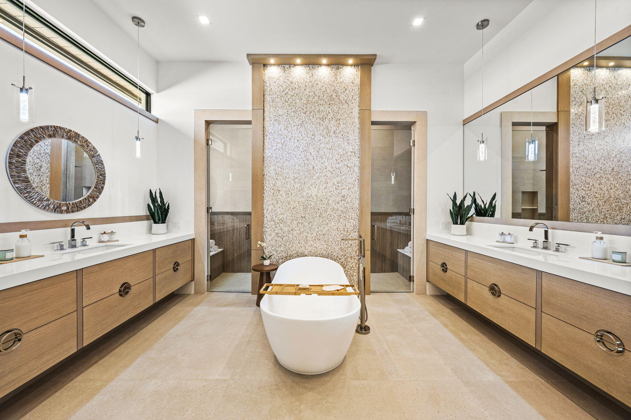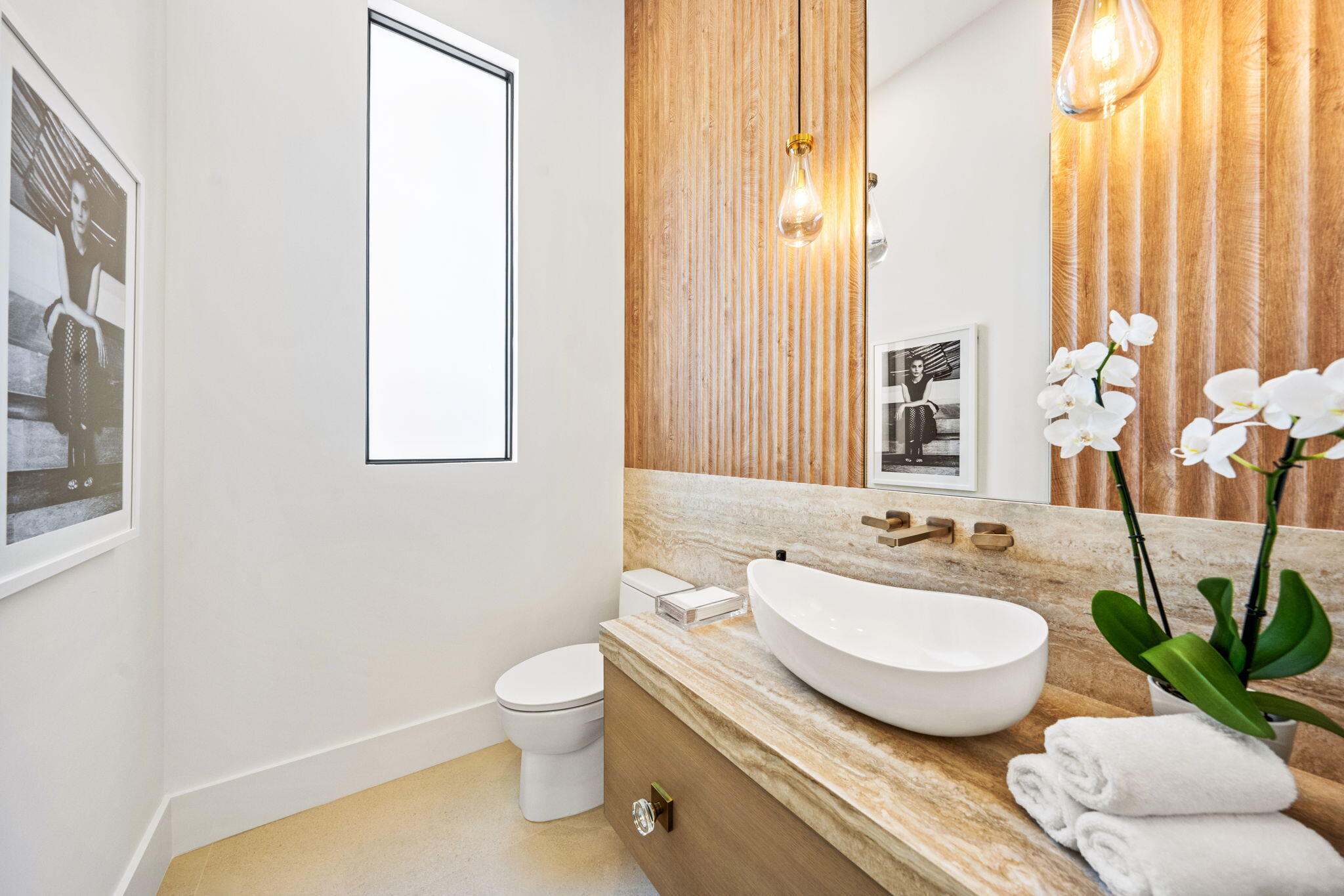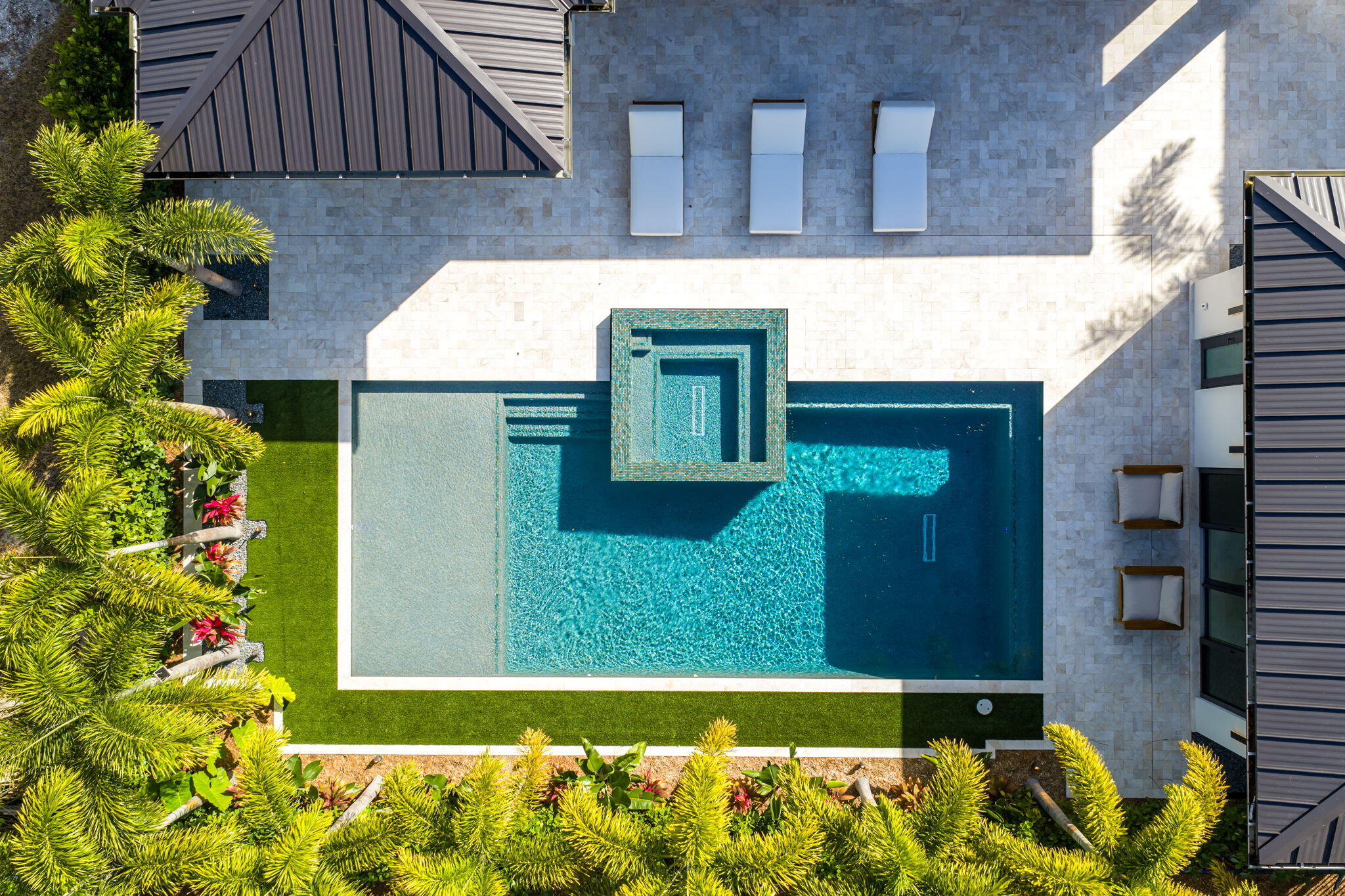 Welcome to 247 Seville Road, a 2025 modern-coastal residence with subtle Balinese influence, custom built by Spyglass Development. Set on an oversized 11,285 SF lot in West Palm Beach's highly desirable SoSo neighborhood, this newly completed estate blends architectural detail, material quality, and livable design into a refined coastal retreat. Offering 6,378 total square feet with 5,112 SF of living space, the main residence includes 4 bedrooms plus an office, 4 full baths and 1 half bath, a double garage, and elevator across 4,785 SF. A detached 327 SF cabana/flex suite with full bath, outdoor shower, and Sub-Zero under-counter drawers functions as a fifth bedroom, guest suite, private office, or fitness studio. A porcelain-travertine facade and 10-foot entry door open to interiors defined by 11'6" ceiling heights with 12-foot coffered accents, 9-foot interior doors on the main level, 10-foot exterior sliders, 48x48 Italian porcelain flooring, and a floating white-oak and glass staircase. Rift-cut white oak cabinetry, fluted wall detailing, and integrated architectural millwork carry throughout the home. The chef's kitchen features Nika Quartzite countertops, a 12' x 5' island, Sub-Zero refrigeration towers, a 48" Wolf 8-burner range, walk-in pantry, and a custom rift-cut oak bar with Sub-Zero wine tower. The first-floor primary suite includes oak flooring, dual custom closets, and a spa-style bath with dual 16-foot showers, soaking tub, and dual water closets. A dedicated office with oak flooring and American black walnut cabinetry is also located on the main level. The second floor offers 10-foot ceilings, a loft with built-ins and Sub-Zero beverage center, secondary laundry, and three en-suite bedrooms including a VIP suite. Bathrooms are finished with imported Spanish porcelain tile and custom cabinetry. Upper-level interior doors are 8 feet. Twelve-foot-wide bypass stackable doors open to a covered loggia with travertine fireplace wall, summer kitchen with grill, sink, and refrigerator, cypress cabinetry, remote-controlled screens, designer lighting, and aluminum tongue-and-groove ceiling in a wood-look finish. The 37 x 16 saltwater pool with sun shelf and 9 x 9 spa are set within professionally designed tropical landscaping. Additional features include a whole-house generator, engineered site drainage system, concrete subfloors for structural and sound stability, EV pre-wire, and an air-conditioned double garage. Located on a quiet, tree-lined street east of Olive Avenue, the residence is moments from Intracoastal Waterway, Summa Beach, Flagler Drive bike path, marinas, golf, dining, Palm Beach Island, downtown West Palm Beach, and Palm Beach International Airport.