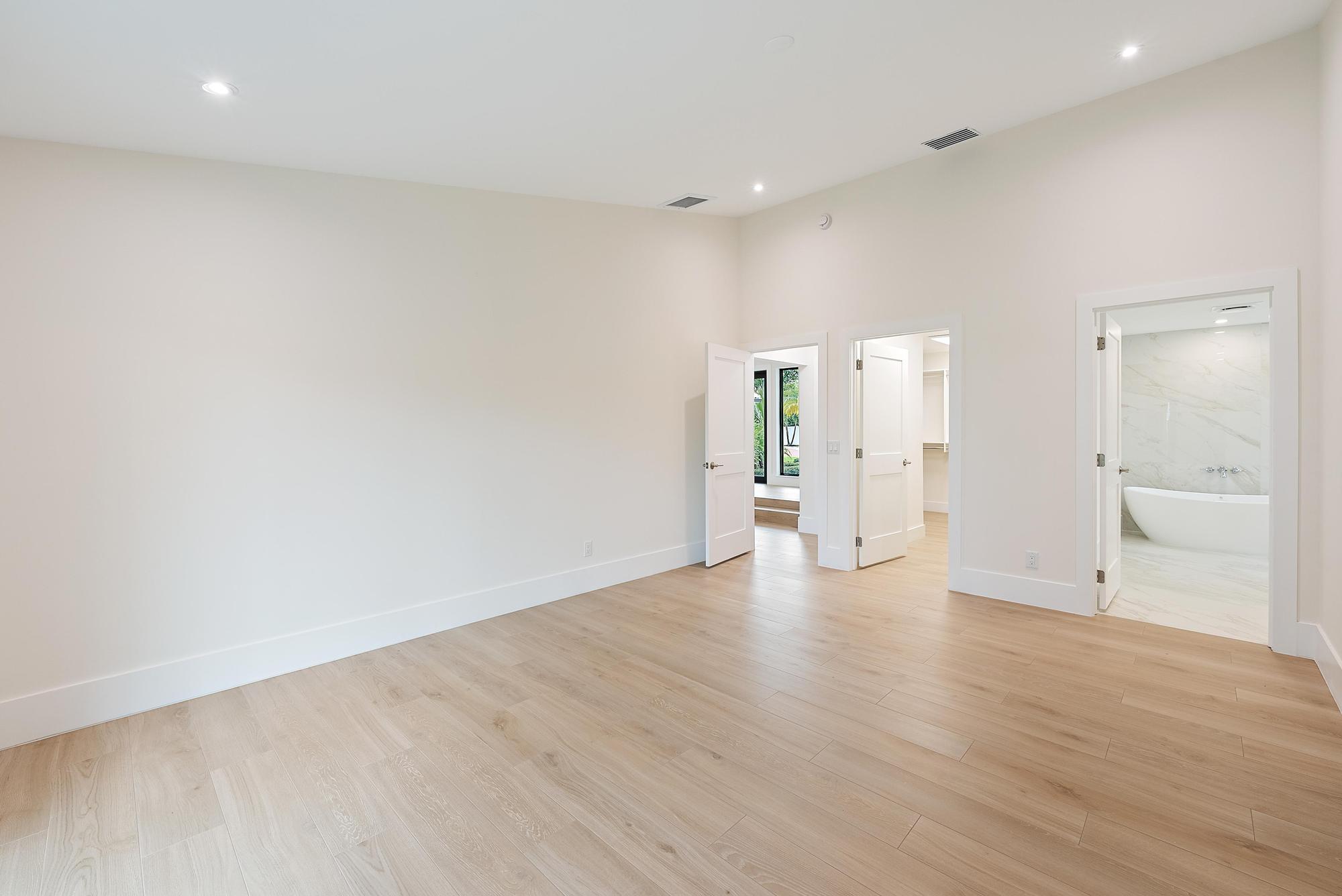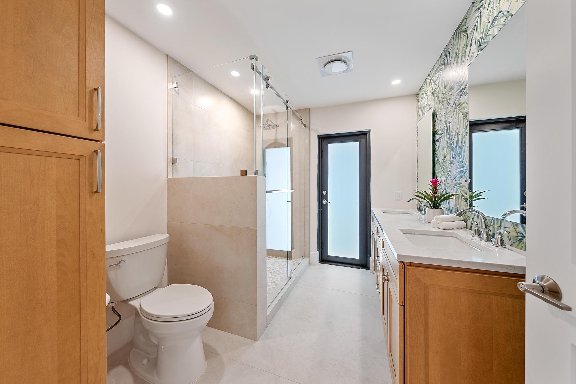 The primary suite is a true retreat, featuring a spa-inspired en-suite bath with an oversized modern shower, soaking tub, double-sink vanity, & a generous custom walk-in closet. Two additional oversized bedrooms offer ample closet space, while a fourth bedroom, ideal as a home office or flex space, features double glass pocket doors. The second bathroom includes dual sinks & also serves as a convenient cabana bath for poolside living.