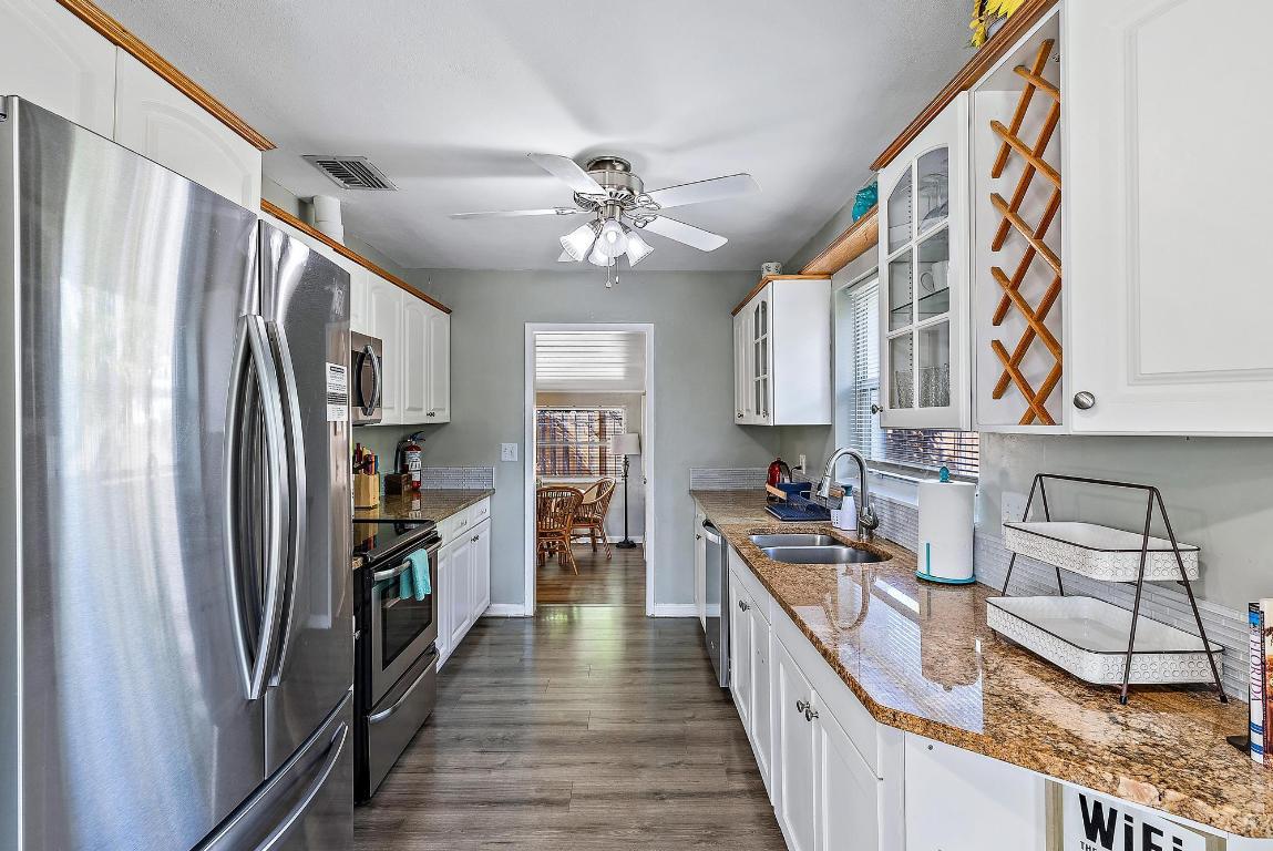 Charming home located in the desirable SoSo neighborhood of coastal WPB. Features: 3 bedrooms, 2 updated bathrooms, updated kitchen w/ granite countertops, & newer fridge, dishwasher, & microwave, 2021 AC, 2019 water heater & a combo of both wood-look & ceramic tile flooring. Situated on a 8,579 sq ft corner lot, this property offers ample outdoor space for your enjoyment. You'll find lush mango trees, + plenty of room for an addition & a swimming pool. Fabulous location; take leisurely strolls or bike rides along the Intracoastal Waterway/Flagler Drive bike path. Easy access to the South Olive Tennis Center/Park/Community Center, & Elementary School. Mins to beaches, Downtown WPB, PBI airport, Brightline station, The Square, Antique Row, Palm Beach, world-class shopping/dining, & more.